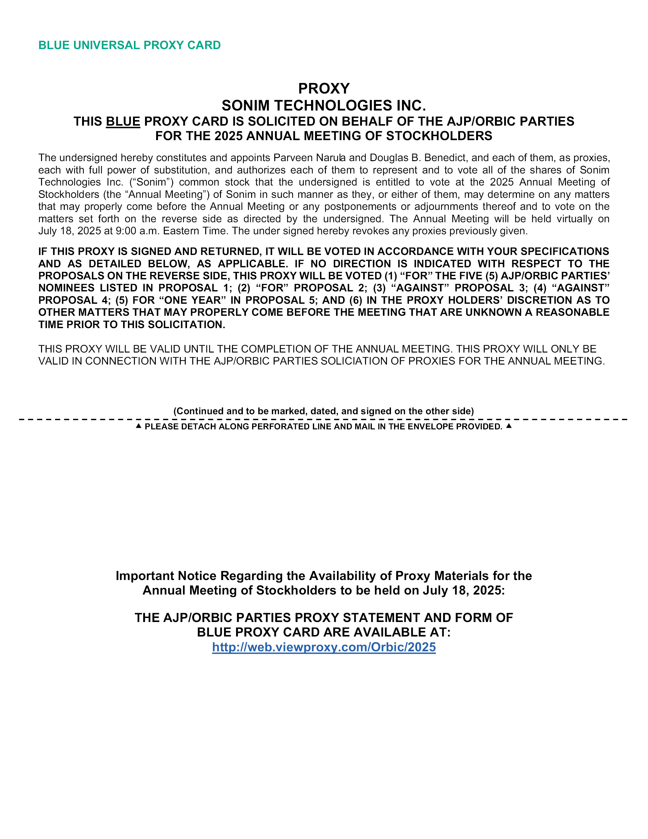 BLUE UNIVERSAL PROXY CARD PLEASE DETACH ALONG PERFORATED LINE AND MAIL IN THE ENVELOPE PROVIDED. (Continued and to be marked, dated, and signed on the other side) PROXY SONIM TECHNOLOGIES INC. THIS BLUE PROXY CARD IS SOLICITED ON BEHALF OF THE AJP/ORBIC PARTIES FOR THE 2025 ANNUAL MEETING OF STOCKHOLDERS The undersigned hereby constitutes and appoints Parveen Narula and Douglas B. Benedict, and each of them, as proxies, each with full power of substitution, and authorizes each of them to represent and to vote all of the shares of Sonim Technologies Inc. (“Sonim”) common stock that the undersigned is entitled to vote at the 2025 Annual Meeting of Stockholders (the “Annual Meeting”) of Sonim in such manner as they, or either of them, may determine on any matters that may properly come before the Annual Meeting or any postponements or adjournments thereof and to vote on the matters set forth on the reverse side as directed by the undersigned. The Annual Meeting will be held virtually on July 18, 2025 at (9:00 a.m. Eastern Time). The undersigned hereby revokes any proxies previously given. IF THIS PROXY IS SIGNED AND RETURNED, IT WILL BE VOTED IN ACCORDANCE WITH YOUR SPECIFICATIONS AND AS DETAILED BELOW, AS APPLICABLE. IF NO DIRECTION IS INDICATED WITH RESPECT TO THE PROPOSALS ON THE REVERSE SIDE, THIS PROXY WILL BE VOTED (1) “FOR” THE FIVE (5) AJP/ORBIC PARTIES’ NOMINEES LISTED IN PROPOSAL 1; (2) “FOR” PROPOSAL 2; (3) “AGAINST” PROPOSAL 3; (4) “AGAINST” PROPOSAL 4; (5) FOR “ONE YEAR” IN PROPOSAL 5; AND (6) IN THE PROXY HOLDERS’ DISCRETION AS TO OTHER MATTERS THAT MAY PROPERLY COME BEFORE THE MEETING THAT ARE UNKNOWN A REASONABLE TIME PRIOR TO THIS SOLICITATION. THIS PROXY WILL BE VALID UNTIL THE COMPLETION OF THE ANNUAL MEETING. THIS PROXY WILL ONLY BE VALID IN CONNECTION WITH THE AJP/ORBIC PARTIES SOLICIATION OF PROXIES FOR THE ANNUAL MEETING. Important Notice Regarding the Availability of Proxy Materials for the Annual Meeting of Stockholders to be held on July 18, 2025: THE AJP/ORBIC PARTIES PROXY STATEMENT AND FORM OF BLUE PROXY CARD ARE AVAILABLE AT: http://web.viewproxy.com/Orbic/2025