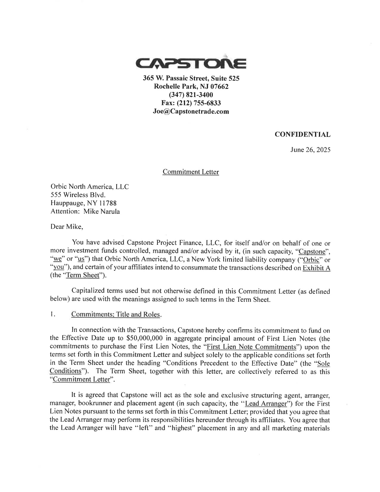 365 W. Passaic Street, Suite 525 Rochelle Park, NJ 07662 (347) 821 - 3400 Fax: (212) 755 - 6833 Joe@Capstonetrade.com CONFIDENTIAL June 26, 2025 Commitment Letter Orbic North America, LLC 555 Wireless Blvd. Hauppauge, NY 11788 Attention: Mike Narula Dear Mike, You have advised Capstone Project Finance, LLC, for itself and/or on behalf of one or more investment funds controlled, managed and/or advised by it, (in such capacity, “ CaDstonc” , “ we ” or “i¡y”) that Orbic North America, LLC, a New York limited liability company (“ Orbic ” or “ you ”), and certain of your affiliates intend to consummate the transactions described on Exhibit A (the “ Term Sheet ”) . Capitalized terms used but not otherwise defined in this Commitment Letter (as defined below) are used with the meanings assigned to such terms in the Term Sheet . 1. Commitments; Title and Roles. In connection with the Transactions, Capstone hereby confirms its commitment to fund on the Effective Date up to $ 50 , 000 , 000 in aggregate principal amount of First Lien Notes (the commitments to purchase the First Lien Notes, the “ First lien Note Commitments” ) upon the terms set forth in this Commitment Letter and subject solely to the applicable conditions set forth in the Term Sheet under the heading “Conditions Precedent to the Effective Date” (the “ Sole Conditions” ) . The Term Sheet, together with this letter, are collectively referred to as this “ Commitment Letter” . It is agreed that Capstone will act as the sole and exclusive structuring agent, arranger, manager, bookrunner and placement agent (in such capacity, the “ Lead Arranger” ) for the First Lien Notes pursuant to the terms set forth in this Commitment Letter ; provided that you agree that the Lead Arranger may perform its responsibilities hereunder through its affiliates . You agree that the Lead Arranger will have “left” and “highest” placement in any and all marketing materials