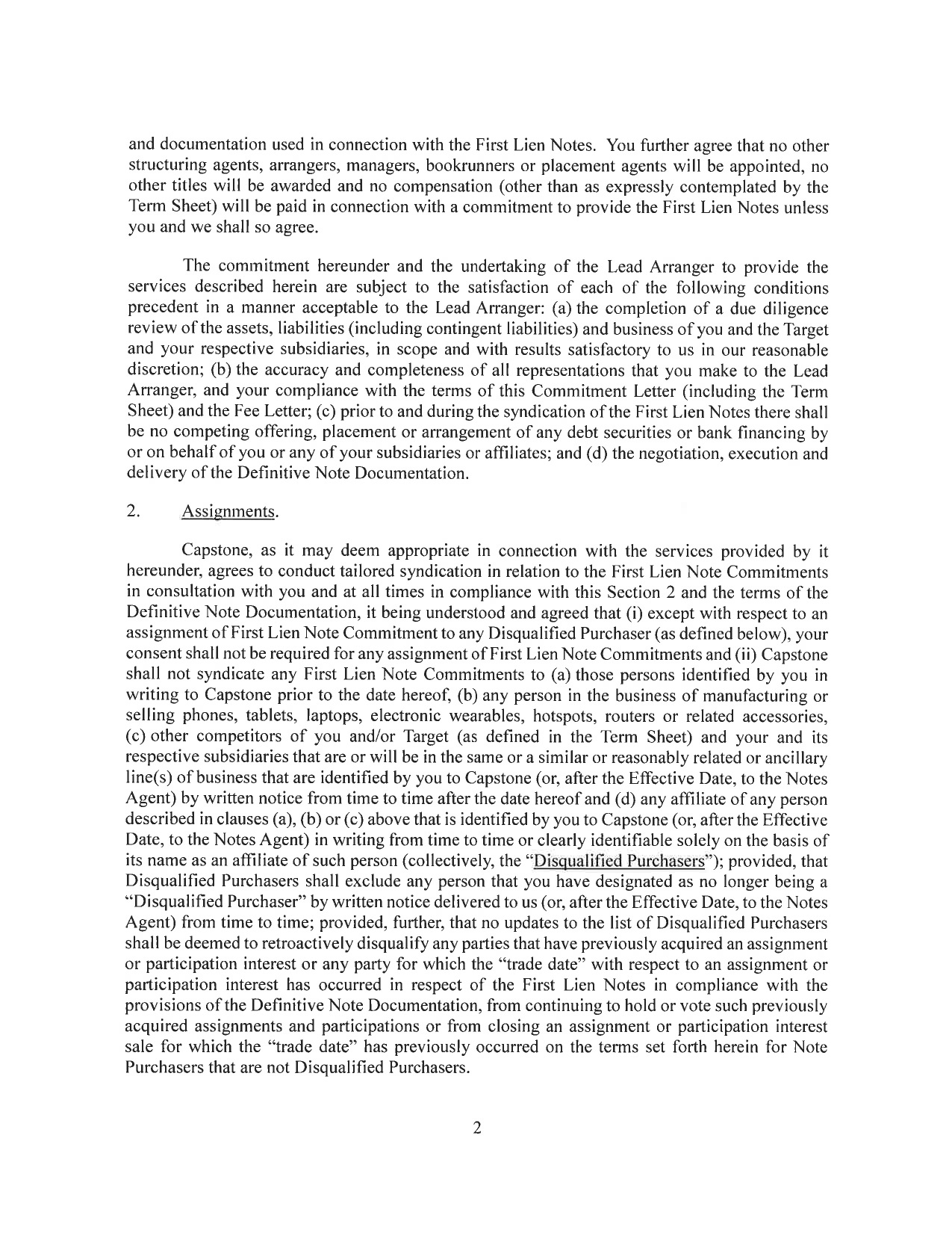 2 and documentation used in connection with the First Lien Notes . You further agree that no other structuring agents, arrangers, managers, bookrunners or placement agents will be appointed, no other titles will be awarded and no compensation (other than as expressly contemplated by the Term Sheet) will be paid in connection with a commitment to provide the First Lien Notes unless you and we shall so agree . The commitment hereunder and the undertaking of the Lead Arranger to provide the services described herein are subject to the satisfaction of each of the following conditions precedent in a manner acceptable to the Lead Arranger : (a) the completion of a due diligence review of the assets, liabilities (including contingent liabilities) and business of you and the Target and your respective subsidiaries, in scope and with results satisfactory to us in our reasonable discretion ; (b) the accuracy and completeness of all representations that you make to the Lead Arranger, and your compliance with the terms of this Commitment Letter (including the Term Sheet) and the Fee Letter ; (c) prior to and during the syndication of the First Lien Notes there shall be no competing offering, placement or arrangement of any debt securities or bank financing by or on behalf of you or any of your subsidiaries or affiliates ; and (d) the negotiation, execution and delivery of the Definitive Note Documentation . 2 . Assignments . Capstone, as it may deem appropriate in connection with the services provided by it hereunder, agrees to conduct tailored syndication in relation to the First Lien Note Commitments in consultation with you and at all times in compliance with this Section 2 and the terms of the Definitive Note Documentation, it being understood and agreed that (i) except with respect to an assignment of First Lien Note Commitment to any Disqualified Purchaser (as defined below), your consent shall not be required for any assignment of First Lien Note Commitments and (ii) Capstone shall not syndicate any First Lien Note Commitments to (a) those persons identified by you in writing to Capstone prior to the date hereof, (b) any person in the business of manufacturing or selling phones, tablets, laptops, electronic wearables, hotspots, routers or related accessories, (c) other competitors of you and/or Target (as defined in the Term Sheet) and your and its respective subsidiaries that are or will be in the same or a similar or reasonably related or ancillary line(s) of business that are identified by you to Capstone (or, after the Effective Date, to the Notes Agent) by written notice from time to time after the date hereof and (d) any affiliate of any person described in clauses (a), (b) or (c) above that is identified by you to Capstone (or, after the Effective Date, to the Notes Agent) in writing from time to time or clearly identifiable solely on the basis of its name as an affiliate of such person (collectively, the “ Disqualified Purchasers ”) ; provided, that Disqualified Purchasers shall exclude any person that you have designated as no longer being a “Disqualified Purchaser” by written notice delivered to us (or, after the Effective Date, to the Notes Agent) from time to time ; provided, further, that no updates to the list of Disqualified Purchasers shall be deemed to retroactively disqualify any parties that have previously acquired an assignment or participation interest or any party for which the “trade date” with respect to an assignment or participation interest has occurred in respect of the First Lien Notes in compliance with the provisions of the Definitive Note Documentation, from continuing to hold or vote such previously acquired assignments and participations or from closing an assignment or participation interest sale for which the “trade date” has previously occurred on the terms set forth herein for Note Purchasers that are not Disqualified Purchasers .
