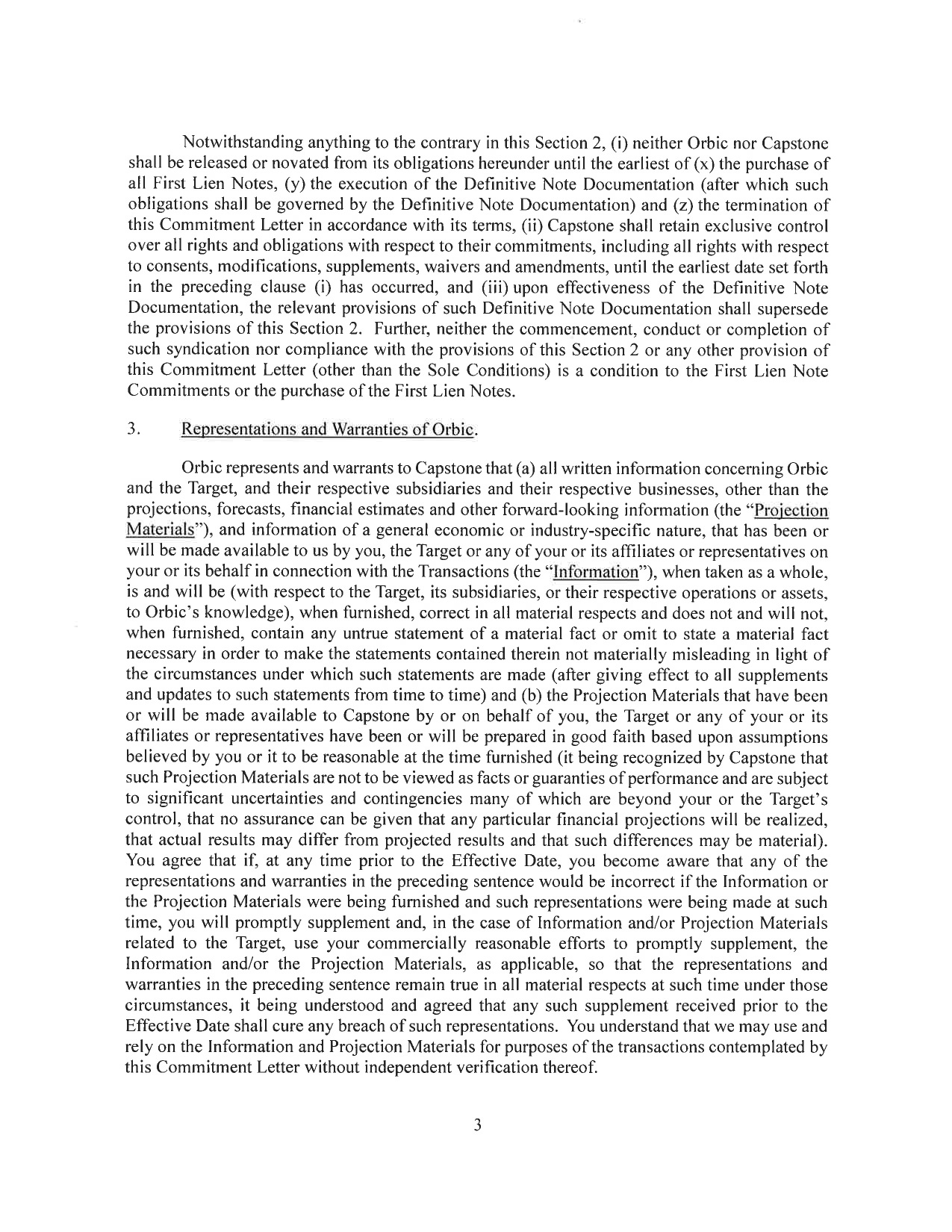 3 Notwithstanding anything to the contrary in this Section 2 , (i) neither Orbic nor Capstone shall be released or novated from its obligations hereunder until the earliest of(x) the purchase of all First Lien Notes, (y) the execution of the Definitive Note Documentation (after which such obligations shall be governed by the Definitive Note Documentation) and (z) the termination of this Commitment Letter in accordance with its terms, (ii) Capstone shall retain exclusive control over all rights and obligations with respect to their commitments, including all rights with respect to consents, modifications, supplements, waivers and amendments, until the earliest date set forth in the preceding clause (i) has occurred, and (iii) upon effectiveness of the Definitive Note Documentation, the relevant provisions of such Definitive Note Documentation shall supersede the provisions of this Section 2 . Further, neither the commencement, conduct or completion of such syndication nor compliance with the provisions of this Section 2 or any other provision of this Commitment Letter (other than the Sole Conditions) is a condition to the First Lien Note Commitments or the purchase of the First Lien Notes . 3. Representations and Warranties of Orbic. Orbic represents and warrants to Capstone that (a) all written information concerning Orbic and the Target, and their respective subsidiaries and their respective businesses, other than the projections, forecasts, financial estimates and other forward - looking information (the “ Projection Materials” ), and information of a general economic or industry - specific nature, that has been or will be made available to us by you, the Target or any of your or its affiliates or representatives on your or its behalf in connection with the Transactions (the “ Information ”), when taken as a whole, is and will be (with respect to the Target, its subsidiaries, or their respective operations or assets, to Orbic's knowledge), when furnished, correct in all material respects and does not and will not, when furnished, contain any untrue statement of a material fact or omit to state a material fact necessary in order to make the statements contained therein not materially misleading in light of the circumstances under which such statements are made (after giving effect to all supplements and updates to such statements from time to time) and (b) the Projection Materials that have been or will be made available to Capstone by or on behalf of you, the Target or any of your or its affiliates or representatives have been or will be prepared in good faith based upon assumptions believed by you or it to be reasonable at the time furnished (it being recognized by Capstone that such Projection Materials are not to be viewed as facts or guaranties of performance and are subject to significant uncertainties and contingencies many of which are beyond your or the Target's control, that no assurance can be given that any particular financial projections will be realized, that actual results may differ from projected results and that such differences may be material) . You agree that if, at any time prior to the Effective Date, you become aware that any of the representations and warranties in the preceding sentence would be incorrect if the Information or the Projection Materials were being furnished and such representations were being made at such time, you will promptly supplement and, in the case of Information and/or Projection Materials related to the Target, use your commercially reasonable efforts to promptly supplement, the Information and/or the Projection Materials, as applicable, so that the representations and warranties in the preceding sentence remain true in all material respects at such time under those circumstances, it being understood and agreed that any such supplement received prior to the Effective Date shall cure any breach of such representations . You understand that we may use and rely on the Information and Projection Materials for purposes of the transactions contemplated by this Commitment Letter without independent verification thereof .