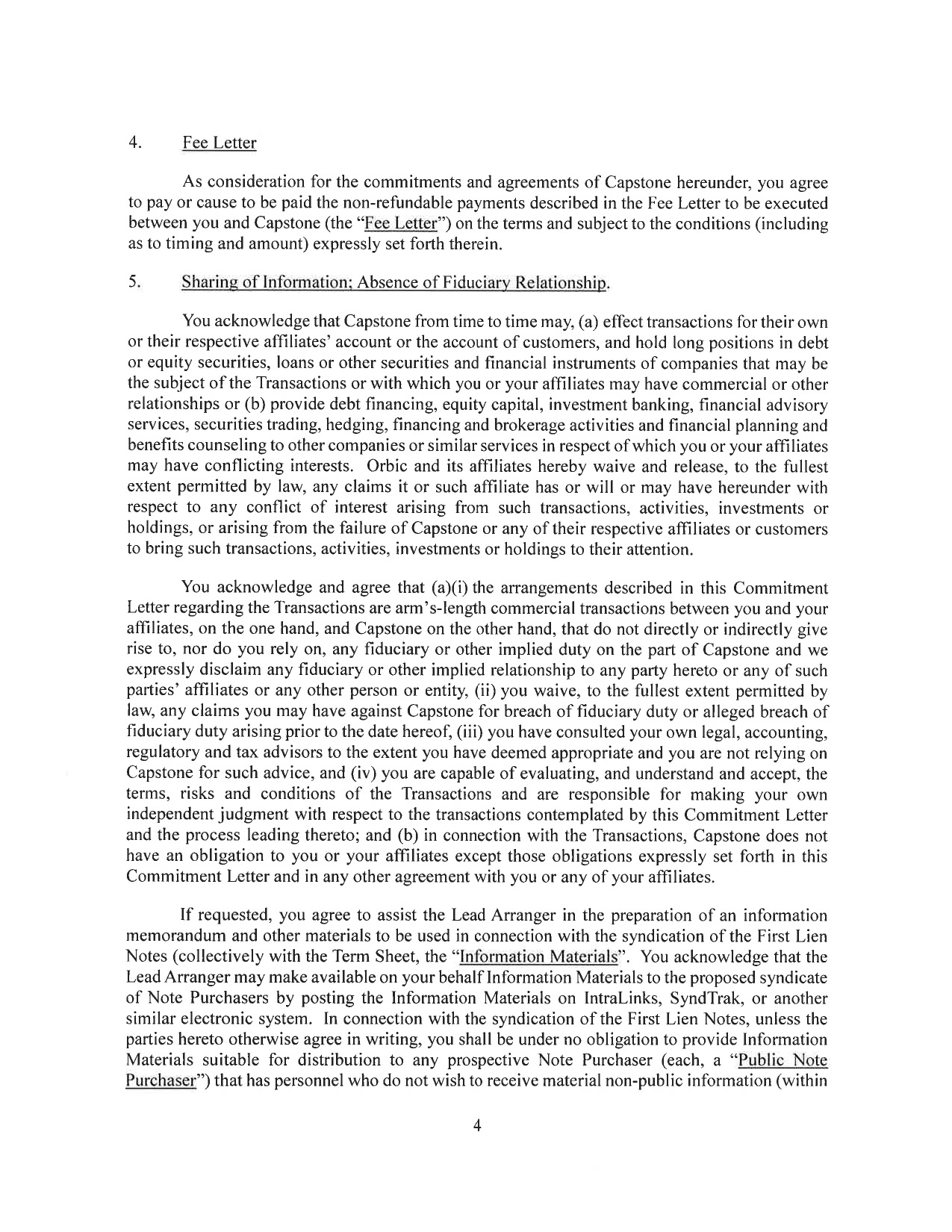 4 4. Fee Letter As consideration for the commitments and agreements of Capstone hereunder, you agree to pay or cause to be paid the non - refundable payments described in the Fee Letter to be executed between you and Capstone (the “ Fee Letter ”) on the terms and subject to the conditions (including as to timing and amount) expressly set forth therein . 5. Sharing of lnforrnation; Absence of Fiduciary Relationship. You acknowledge that Capstone from time to time may, (a) effect transactions for their own or their respective affiliates' account or the account of customers, and hold long positions in debt or equity securities, loans or other securities and financial instruments of companies that may be the subject of the Transactions or with which you or your affiliates may have commercial or other relationships or (b) provide debt financing, equity capital, investment banking, financial advisory services, securities tTading, hedging, financing and brokerage activities and financial planning and benefits counseling to other companies or similar services in respect of which you or your affi liates may have conflicting interests . Orbic and its affiliates hereby waive and release, to the fullest extent permitted by law, any claims it or such affiliate has or will or may have hereunder with respect to any conflict of interest arising from such transactions, activities, investments or holdings, or arising from the failure of Capstone or any of their respective affiliates or customers to bring such transactions, activities, investments or holdings to their attention . You acknowledge and agree that (a)(i) the arrangements described in this Commitment Letter regarding the Transactions are arm’s - length commercial transactions between you and your affiliates, on the one hand, and Capstone on the other hand, that do not directly or indirectly give rise to, nor do you rely on, any fiduciary or other implied duty on the part of Capstone and we expressly disclaim any fiduciary or other implied relationship to any party hereto or any of such parties’ affiliates or any other person or entity, (ii) you waive, to the fullest extent permitted by law, any claims you may have against Capstone for breach of fiduciary duty or alleged breach of fiduciary duty arising prior to the date hereof, (iii) you have consulted your own legal, accounting, regulatory and tax advisors to the extent you have deemed appropriate and you are not relying on Capstone for such advice, and (iv) you are capable of evaluating, and understand and accept, the terms, risks and conditions of the Transactions and are responsible for making your own independent judgment with respect to the transactions contemplated by this Commitment Letter and the process leading thereto ; and (b) in connection with the Transactions, Capstone does not have an obligation to you or your affiliates except those obligations expressly set forth in this Commitment Letter and in any other agreement with you or any of your affiliates . If requested, you agree to assist the Lead Arranger in the preparation of an information memorandum and other materials to be used in connection with the syndication of the First Lien Notes (collectively with the Term Sheet, the “ Information Materials” . You acknowledge that the Lead Arranger may make available on your behalf Information Materials to the proposed syndicate of Note Purchasers by posting the Information Materials on IntraLinks, SyndTrak, or another similar electronic system . In connection with the syndication of the First Lien Notes, unless the parties hereto otherwise agree in writing, you shall be under no obligation to provide Information Materials suitable for distribution to any prospective Note Purchaser (each, a “ Public Note Purchaser” ) that has personnel who do not wish to receive material non - public information (within