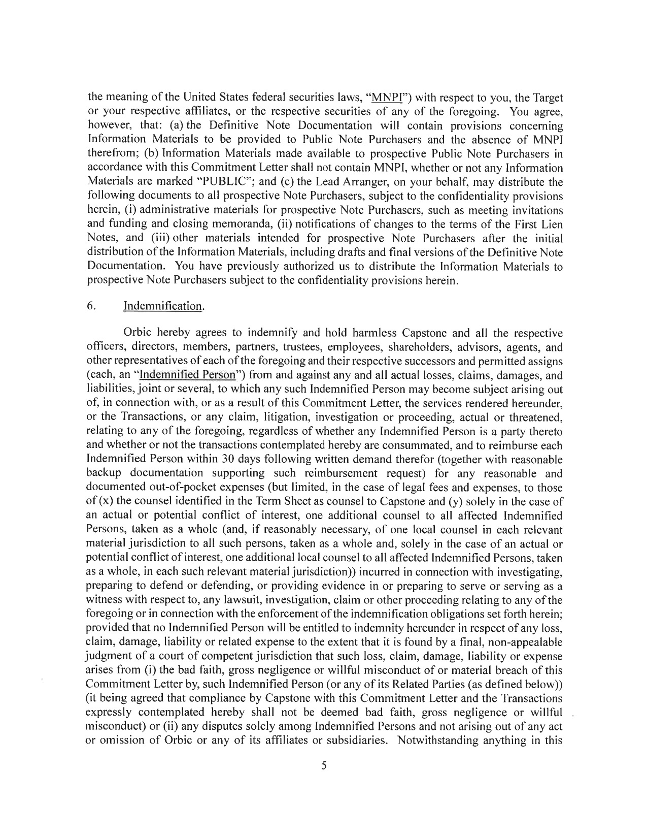 or omission of Orbic or any of its affiliates or subsidiaries. Notwithstanding anything in this 5 the meaning of the United States federal securities laws, “ MNPI ”) with respect to you, the Target or your respective affiliates, or the respective securities of any of the foregoing . You agree, however, that : (a) the Definitive Note Documentation will contain provisions concerning Information Materials to be provided to Public Note Purchasers and the absence of MNPI therefrom ; (b) Information Materials made available to prospective Public Note Purchasers in accordance with this Commitment Letter shall not contain MNPI, whether or not any Information Materials are marked “PUBLIC” ; and (c) the Lead Arranger, on your behalf, may distribute the following documents to all prospective Note Purchasers, subject to the confidentiality provisions herein, (i) administTative materials for prospective Note Purchasers, such as meeting invitations and funding and closing memoranda, (ii) notifications of changes to the terms of the First Lien Notes, and (iii) other materials intended for prospective Note Purchasers after the initial distribution of the Information Materials, including drafts and final versions of the Definitive Note Documentation . You have previously authorized us to distribute the Information Materials to prospective Note Purchasers subject to the confidentiality provisions herein . 6. Indemnification. Orbic hereby agrees to indemnify and hold harmless Capstone and all the respective officers, directors, members, partners, trustees, employees, shareholders, advisors, agents, and other representatives of each of the foregoing and their respective successors and permitted assigns (each, an “ Indemnified Person” ) from and against any and all actual losses, claims, damages, and liabilities, joint or several, to which any such Indemnified Person may become subject arising out of, in connection with, or as a result of this Commitment Letter, the services rendered hereunder, or the Transactions, or any claim, litigation, investigation or proceeding, actual or threatened, relating to any of the foregoing, regardless of whether any Indemnified Person is a party thereto and whether or not the transactions contemplated hereby are consummated, and to reimburse each Indemnified Person within 30 days following written demand therefor (together with reasonable backup documentation supporting such reimbursement request) for any reasonable and documented out - of - pocket expenses (but limited, in the case of legal fees and expenses, to those of(x) the counsel identified in the Term Sheet as counsel to Capstone and (y) solely in the case of an actual or potential conflict of interest, one additional counsel to all affected Indemnified Persons, taken as a whole (and, if reasonably necessary, of one local counsel in each relevant material jurisdiction to all such persons, taken as a whole and, solely in the case of an actual or potential conflict of interest, one additional local counsel to all affected Indemnified Persons, taken as a whole, in each such relevant material jurisdiction)) incurred in connection with investigating, preparing to defend or defending, or providing evidence in or preparing to serve or serving as a witness with respect to, any lawsuit, investigation, claim or other proceeding relating to any of the foregoing or in connection with the enforcement of the indemnification obligations set forth herein ; provided that no Indemnified Person will be entitled to indemnity hereunder in respect of any loss, claim, damage, liability or related expense to the extent that it is found by a final, non - appealable judgment of a court of competent jurisdiction that such loss, claim, damage, liability or expense arises from (i) the bad faith, gross negligence or willful misconduct of or material breach of this Commitment Letter by, such Indemnified Person (or any of its Related Parties (as defined below)) (it being agreed that compliance by Capstone with this Commitment Letter and the Transactions expressly contemplated hereby shall not be deemed bad faith, gross negligence or willful misconduct) or (ii) any disputes solely among Indemnified Persons and not arising out of any act