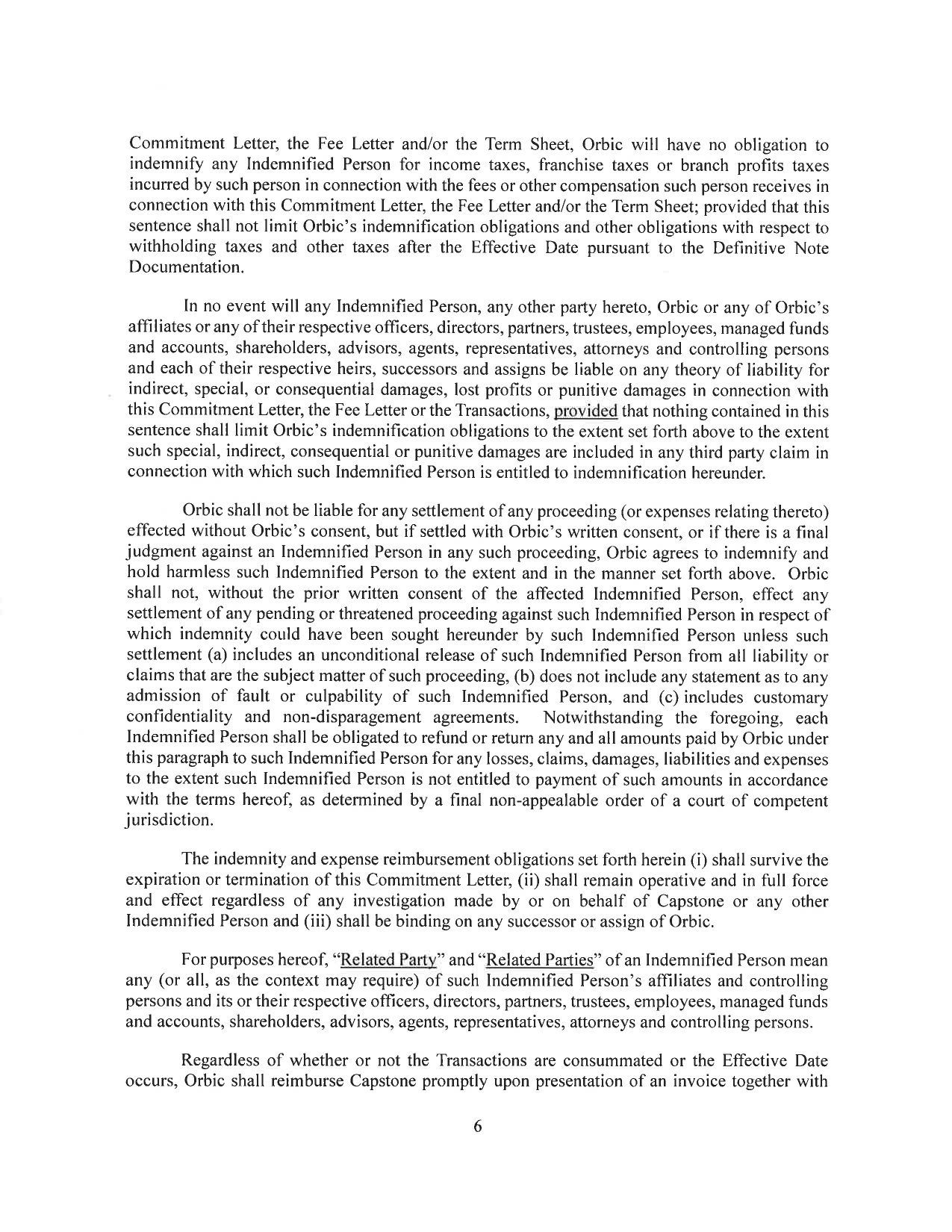 occurs, Orbic shall reimburse Capstone promptly upon presentation of an invoice together with 6 Commitment Letter, the Fee Letter and/or the Term Sheet, Orbic will have no obligation to indemnify any Indemnified Person for income taxes, franchise taxes or branch profits taxes incurred by such person in connection with the fees or other compensation such person receives in connection with this Commitment Letter, the Fee Letter and/or the Term Sheet ; provided that this sentence shall not limit Orbic's indemnification obligations and other obligations with respect to withholding taxes and other taxes after the Effective Date pursuant to the Definitive Note Documentation . In no event will any Indemnified Person, any other party hereto, Orbic or any of Orbic's affiliates or any of their respective officers, directors, partners, trustees, employees, managed funds and accounts, shareholders, advisors, agents, representatives, attorneys and controlling persons and each of their respective heirs, successors and assigns be liable on any theory of liability for indirect, special, or consequential damages, lost profits or punitive damages in connection with this Commitment Letter, the Fee Letter or the Transactions, provided that nothing contained in this sentence shall limit Orbic's indemnification obligations to the extent set forth above to the extent such special, indirect, consequential or punitive damages are included in any third party claim in connection with which such Indemnified Person is entitled to indemnification hereunder . Orbic shall not be liable for any settlement of any proceeding (or expenses relating thereto) effected without Orbic’s consent, but if settled with Orbic's written consent, or if there is a final judgment against an Indemnified Person in any such proceeding, Orbic agrees to indemnify and hold harmless such Indemnified Person to the extent and in the manner set forth above . Orbic shall not, without the prior written consent of the affected Indemnified Person, effect any settlement of any pending or threatened proceeding against such Indemnified Person in respect of which indemnity could have been sought hereunder by such Indemnified Person unless such settlement (a) includes an unconditional release of such Indemnified Person from all liability or claims that are the subject matter of such proceeding, (b) does not include any statement as to any admission of fault or culpability of such Indemnified Person, and (c) includes customary confidentiality and non - disparagement agreements . Notwithstanding the foregoing, each Indemnified Person shall be obligated to refund or return any and all amounts paid by Orbic under this paragraph to such Indemnified Person for any losses, claims, damages, liabilities and expenses to the extent such Indemnified Person is not entitled to payment of such amounts in accordance with the terms hereof, as determined by a final non - appealable order of a court of competent jurisdiction . The indemnity and expense reimbursement obligations set forth herein (i) Shall survive the expiration or termination of this Commitment Letter, (ii) shall remain operative and in full force and effect regardless of any investigation made by or on behalf of Capstone or any other Indemnified Person and (iii) shall be binding on any successor or assign of Orbic . For purposes hereof, “ Related PartY ” and “ Related Parties” of an Indemnified Person mean any (or all, as the context may require) of such lndemnified Person's affiliates and controlling persons and its or their respective officers, directors, partners, trustees, employees, managed funds and accounts, shareholders, advisors, agents, representatives, attorneys and controlling persons . Regardless of whether or not the Transactions are consummated or the Effective Date