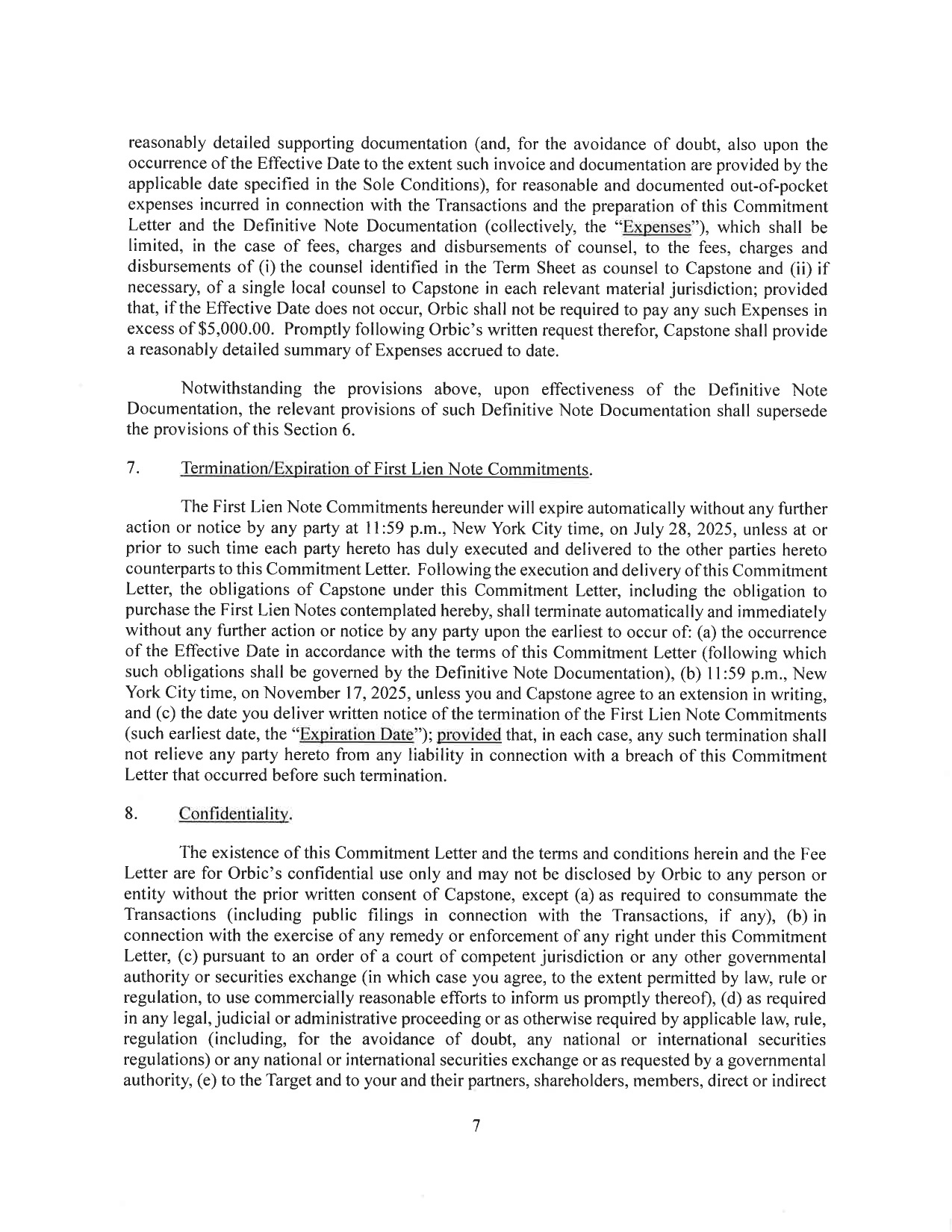 authority, (e) to the Target and to your and their partners, shareholders, members, direct or indirect 7 reasonably detailed supporting documentation (and, for the avoidance of doubt, also upon the occurrence of the Effective Date to the extent such invoice and documentation are provided by the applicable date specified in the Sole Conditions), for reasonable and documented out - of - pocket expenses incurred in connection with the Transactions and the preparation of this Commitment Letter and the Definitive Note Documentation (collectively, the “ Expenses” ), which shall be limited, in the case of fees, charges and disbursements of counsel, to the fees, charges and disbursements of (i) the counsel identified in the Term Sheet as counsel to Capstone and (ii) if necessary, of a single local counsel to Capstone in each relevant material jurisdiction ; provided that, if the Effective Date does not occur, Orbic shall not be required to pay any such Expenses in excess of $ 5 , 000 . 00 . Promptly following Orbic's written request therefor, Capstone shall provide a reasonably detailed summary of Expenses accrued to date . Notwithstanding the provisions above, upon effectiveness of the Definitive Note Documentation, the relevant provisions of such Definitive Note Documentation shall supersede the provisions of this Section 6 . 7. Termination/Expiration of First Lien Note Commitments. The First I . ien Note Commitments hereunder will expire automatically without any further action or notice by any party at 11 : 59 p . m . , New York City time, on July 28 , 2025 , unless at or prior to such time each party hereto has duly executed and delivered to the other parties hereto counterparts to this Commitment Letter . Following the execution and delivery of this Commitment Letter, the obligations of Capstone under this Commitment Letter, including the obligation to purchase the First Lien Notes contemplated hereby, shall terminate automatically and immediately without any further action or notice by any party upon the earliest to occur of : (a) the occurrence of the Effective Date in accordance with the terms of this Commitment Letter (following which such obligations shall be governed by the Definitive Note Documentation), (b) 11 : 59 p . m . , New York City time, on November 17 , 2025 , unless you and Capstone agree to an extension in writing, and (c) the date you deliver written notice of the termination of the First Lien Note Commitments (such earliest date, the “ Expiration Date ”) ; provided that, in each case, any such termination shall not relieve any party hereto from any liability in connection with a breach of this Commitment Letter that occurred before such termination . 8. Confidentialitx . The existence of this Commitment Letter and the terms and conditions herein and the Fee Letter are for Orbic's confidential use only and may not be disclosed by Orbic to any person or entity without the prior written consent of Capstone, except (a) as required to consummate the Transactions (including public filings in connection with the Transactions, if any), (b) in connection with the exercise of any remedy or enforcement of any right under this Commitment Letter, (c) pursuant to an order of a court of competent jurisdiction or any other governmental authority or securities exchange (in which case you agree, to the extent permitted by law, rule or regulation, to use commercially reasonable efforts to inform us promptly thereof), (d) as required in any legal, judicial or administrative proceeding or as otherwise required by applicable law, rule, regulation (including, for the avoidance of doubt, any national or international securities regulations) or any national or international securities exchange or as requested by a governmental