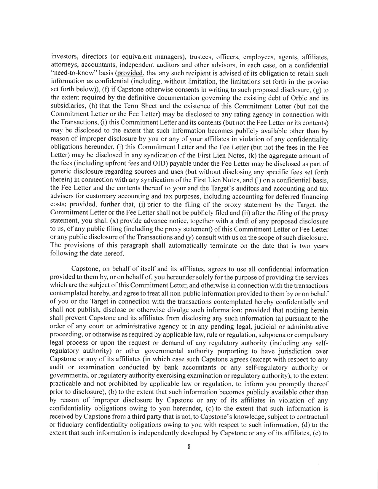 extent that such information is independently developed by Capstone or any of its affiliates, (e) to 8 investors, directors (or equivalent managers), trustees, officers, employees, agents, affiliates, attorneys, accountants, independent auditors and other advisors, in each case, on a confidential “need - to - know” basis ( provided, that any such recipient is advised of its obligation to retain such information as confidential (including, without limitation, the limitations set forth in the proviso set forth below)), (I) if Capstone otherwise consents in writing to such proposed disclosure, (g) to the extent required by the definitive documentation governing the existing debt of Orbic and its subsidiaries, (h) that the Term Sheet and the existence of this Commitment Letter (but not the Commitment Letter or the Fee Letter) may be disclosed to any rating agency in connection with the Transactions, (i) this Commitment Letter and its contents (but not the Fee Letter or its contents) may be disclosed to the extent that such information becomes publicly available other than by reason of improper disclosure by you or any of your affiliates in violation of any confidentiality obligations hereunder, (j) this Commitment Letter and the Fee Letter (but not the fees in the Fee Letter) may be disclosed in any syndication of the First Lien Notes, (k) the aggregate amount of the fees (including upfront fees and OID) payable under the Fee Letter may be disclosed as part of generic disclosure regarding sources and uses (but without disclosing any specific fees set forth therein) in connection with any syndication of the First Lien Notes, and (l) on a confidential basis, the Fee Letter and the contents thereof to your and the Target's auditors and accounting and tax advisers for customary accounting and tax purposes, including accounting for deferred financing costs ; provided, further that, (i) prior to the filing of the proxy statement by the Target, the Commitment Letter or the Fee Letter shall not be publicly filed and (ii) after the filing of the proxy statement, you shall (x) provide advance notice, together with a draft of any proposed disclosure to us, of any public filing (including the proxy statement) of this Commitment Letter or Fee Letter or any public disclosure of the Transactions and (y) consult with us on the scope of such disclosure . The provisions of this paragraph shall automatically terminate on the date that is two years following the date hereof . Capstone, on behalf of itself and its affiliates, agrees to use all confidential information provided to them by, or on behalf of, you hereunder solely for the purpose of providing the services which are the subject of this Commitment Letter, and otherwise in connection with the transactions contemplated hereby, and agree to treat all non - public information provided to them by or on behalf of you or the Target in connection with the transactions contemplated hereby confidentially and shall not publish, disclose or otherwise divulge such information ; provided that nothing herein shall prevent Capstone and its affiliates from disclosing any such information (a) pursuant to the order of any coun or administrative agency or in any pending legal, judicial or administrative proceeding, or otherwise as required by applicable law, rule or regulation, subpoena or compulsory legal process or upon the request or demand of any regulatory authority (including any self - regulatory authority) or other governmental authority purporting to have jurisdiction over Capstone or any of its affiliates (in which case such Capstone agrees (except with respect to any audit or examination conducted by bank accountants or any self - regulatory authority or governmental or regulatory authority exercising examination or regulatory authority), to the extent practicable and not prohibited by applicable law or regulation, to inform you promptly thereof prior to diSClosure), (b) to the extent that such information becomes publicly available other than by reason of improper disclosure by Capstone or any of its affi liates in violation of any confidentiality obligations owing to you hereunder, (c) to the extent that such information is received by Capstone from a third party that is not, to Capstone's knowledge, subject to contractual or fiduciary confidentiality obligations owing to you with respect to such information, (d) to the