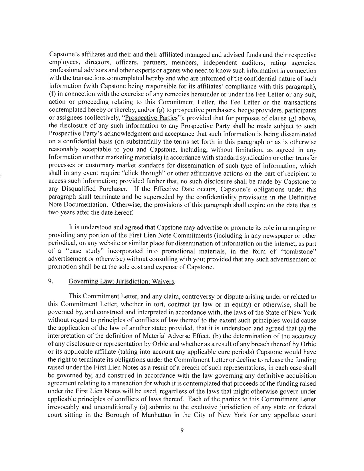 9 Capstone's affiliates and their and their affiliated managed and advised funds and their respective employees, directors, officers, partners, members, independent auditors, rating agencies, professional advisors and other experts or agents who need to know such information in connection with the transactions contemplated hereby and who are informed of the confidential nature of such information (with Capstone being responsible for its affiliates' compliance with this paragraph), (f) in connection with the exercise of any remedies hereunder or under the Fee Letter or any suit, action or proceeding relating to this Commitment Letter, the Fee Letter or the transactions contemplated hereby or thereby, and/or (g) to prospective purchasers, hedge providers, participants or assignees (collectively, “ Prospective Parties” ) ; provided that for purposes of clause (g) above, the disclosure of any such information to any Prospective Party shall be made subject to such Prospective Party's acknowledgment and acceptance that such information is being disseminated on a confidential basis (on substantially the terms set forth in this paragraph or as is otherwise reasonably acceptable to you and Capstone, including, without limitation, as agreed in any Information or other marketing materials) in accordance with standard syndication or other transfer processes or customary market standards for dissemination of such type ot information, which shall in any event require “click through” or other affirmative actions on the part of recipient to access such information ; provided further that, no such disclosure shall be made by Capstone to any Disqualified Purchaser . If the Effective Date occurs, Capstone's obligations under this paragraph shall terminate and be superseded by the confidentiality provisions in the Definitive Note Documentation . Otherwise, the provisions of this paragraph shall expire on the date that is two years after the date hereof . It is understood and agreed that Capstone may advertise or promote its role in arranging or providing any portion of the First Lien Note Commitments (including in any newspaper or other periodical, on any website or similar place for dissemination of information on the internet, as part of a “case study” incorporated into promotional materials, in the form of “tombstone” advertisement or otherwise) without consulting with you ; provided that any such advertisement or promotion shall be at the sole cost and expense of Capstone . 9 . Governing Law : Jurisdiction ; Waivers . This Commitment Letter, and any claim, controversy or dispute arising under or related to this Commitment Letter, whether in tort, contract (at law or in equity) or otherwise, shall be governed by, and construed and interpreted in accordance with, the laws of the State of New York without regard to principles of conflicts of law thereof to the extent such principles would cause the application of the law of another state ; provided, that it is understood and agreed that (a) the interpretation of the definition of Material Adverse Effect, (b) the determination of the accuracy of any disclosure or representation by Orbic and whether as a result of any breach thereof by Orbic or its applicable affiliate (taking into account any applicable cure periods) Capstone would have the right to terminate its obligations under the Commitment Letter or decline to release the funding raised under the First Lien Notes as a result of a breach of such representations, in each case shall be governed by, and construed in accordance with the law governing any definitive acquisition agreement relating to a transaction for which it is contemplated that proceeds of the funding raised under the First Lien Notes will be used, regardless of the laws that might otherwise govern under applicable principles of conflicts of laws thereof . Each of the parties to this Commitment Letter irrevocably and unconditionally (a) submits to the exclusive jurisdiction of any state or federal court sitting in the Borough of Manhattan in the City of New York (or any appellate court