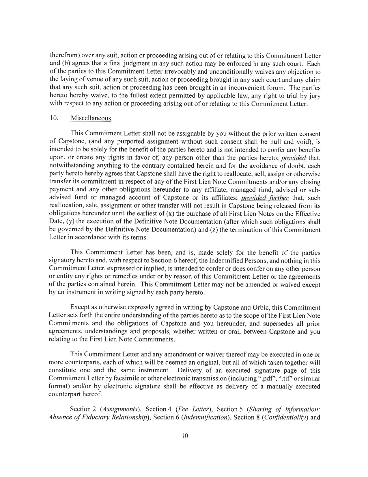 10 therefrom) over any suit, action or proceeding arising out of or relating to this Commitment Letter and (b) agrees that a final judgment in any such action may be enforced in any such court . Each of the parties to this Commitment Letter irrevocably and unconditionally waives any objection to the laying of venue of any such suit, action or proceeding brought in any such court and any claim that any such suit, action or proceeding has been brought in an inconvenient forum . The parties hereto hereby waive, to the fullest extent permitted by applicable law, any right to trial by jury with respect to any action or proceeding arising out of or relating to this Commitment Letter . 10. Miscellaneous . This Commitment Letter shall not be assignable by you without the prior written consent of Capstone, (and any purported assignment without such consent shall be null and void), is intended to be solely for the benefit of the parties hereto and is not intended to confer any benefits upon, or create any rights in favor of, any person other than the parties hereto ; provided that, notwithstanding anything to the contrary contained herein and for the avoidance of doubt, each party hereto hereby agrees that Capstone shall have the right to reallocate, sell, assign or otherwise transfer its commitment in respect of any of the First Lien Note Commitments and/or any closing payment and any other obligations hereunder to any affiliate, managed fund, advised or sub - advised fund or managed account of Capstone or its affiliates ; piovided liiFther that, such reallocation, sale, assignment or other transfer will not result in Capstone being released from its obligations hereunder until the earliest of(x) the purchase of all First Lien Notes on the Effective Date, (y) the execution of the Definitive Note Documentation (after which such obligations shall be governed by the Definitive Note Documentation) and (z) the termination of this Commitment Letter in accordance with its terms . This Commitment Letter has been, and is, made solely for the benefit of the parties signatory hereto and, with respect to Section 6 hereof, the Indemnified Persons, and nothing in this Commitment Letter, expressed or implied, is intended to confer or does confer on any other person or entity any rights or remedies under or by reason of this Commitment Letter or the agreements of the parties contained herein . This Commitment Letter may not be amended or waived except by an instrument in writing signed by each party hereto . Except as otherwise expressly agreed in writing by Capstone and Orbic, this Commitment Letter sets forth the entire understanding of the parties hereto as to the scope of the First Lien Note Commitments and the obligations of Capstone and you hereunder, and supersedes all prior agreements, understandings and proposals, whether written or oral, between Capstone and you relating to the First Lien Note Commitments . This Commitment Letter and any amendment or waiver thereof may be executed in one or more counterparts, each of which will be deemed an original, but all of which taken together will constitute one and the same instrument . Delivery of an executed signature page of this Commitment Letter by facsimile or other electronic transmission (including “ . pdf’, “ . tifi’ or similar format) and/or by electronic signature shall be effective as delivery of a manually executed counterpart hereof . Section 2 {Assignments), Section 4 (Fee Letter), Section S (Sharing of Information,’ Absence of Fiduciary Relationship), Section 6 {Indemnification), Section 8 {Confidentiality) and