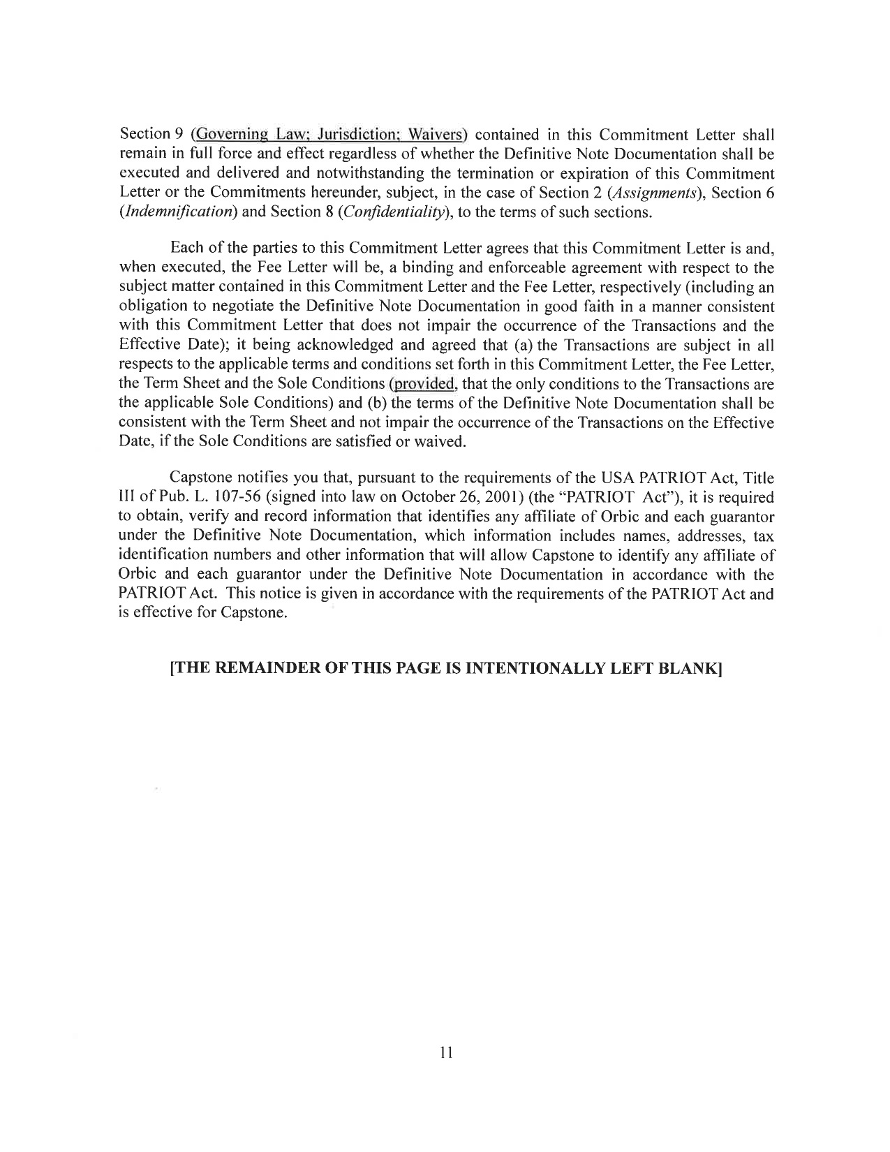 11 Section 9 ( Governing Law : Jurisdiction : Waivers) contained in this Commitment Letter shall remain in full force and effect regardless of whether the Definitive Note Documentation shall be executed and delivered and notwithstanding the termination or expiration of this Commitment Letter or the Commitments hereunder, subject, in the case of Section 2 (Assignments), Section 6 (Indemnification) and Section 8 (Confidentiality), to the terms of such sections . Each of the parties to this Commitment Letter agrees that this Commitment Letter is and, when executed, the Fee Letter will be, a binding and enforceable agreement with respect to the subject matter contained in this Commitment Letter and the Fee Letter, respectively (including an obligation to negotiate the Definitive Note Documentation in good faith in a manner consistent with this Commitment Letter that does not impair the occurrence of the Transactions and the Effective Date) ; it being acknowledged and agreed that (a) the Transactions are subject in all respects to the applicable terms and conditions set forth in this Commitment Letter, the Fee Letter, the Term Sheet and the Sole Conditions o(prvied,d that the only conditions to the Transactions are the applicable Sole Conditions) and (b) the terms of the Definitive Note Documentation shall be consistent with the Term Sheet and not impair the occurrence of the Transactions on the Effective Date, if the Sole Conditions are satisfied or waived . Capstone notifies you that, pursuant to the requirements of the USA PATRIOT Act, Title III of Pub . L . 107 - 56 (signed into law on October 26 , 2001 ) (the “PATRIOT Act”), it is required to obtain, verify and record information that identifies any affi liate of Orbic and each guarantor under the Definitive Note Documentation, which information includes names, addresses, tax identification numbers and other information that will allow Capstone to identify any affiliate of Orbic and each guarantor under the Definitive Note Documentation in accordance with the PATRIOT Act . This notice is given in accordance with the requirements of the PATRIOT Act and is effective for Capstone . [THE REMAINDER OF THIS PAGE IS INTENTIONALLY LEFT BLANK]