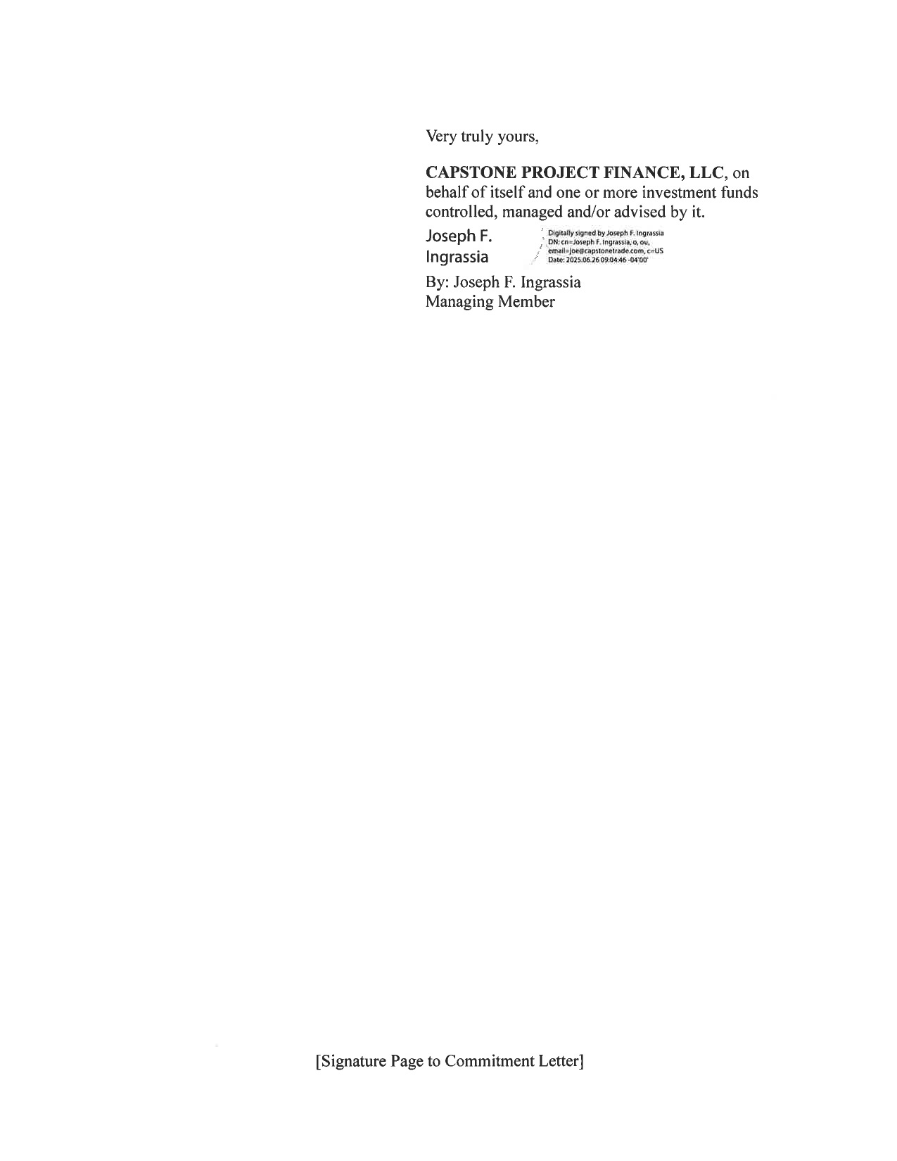 Very truly yours, CAPSTONE PROJECT FINANCE, LLC, on behalf of itself and one or more investment funds controlled, managed and/or advised by it. Joseph F. Ingrassia By: Joseph F. Ingrassia Managing Member [Signature Page to Commitment Letter]