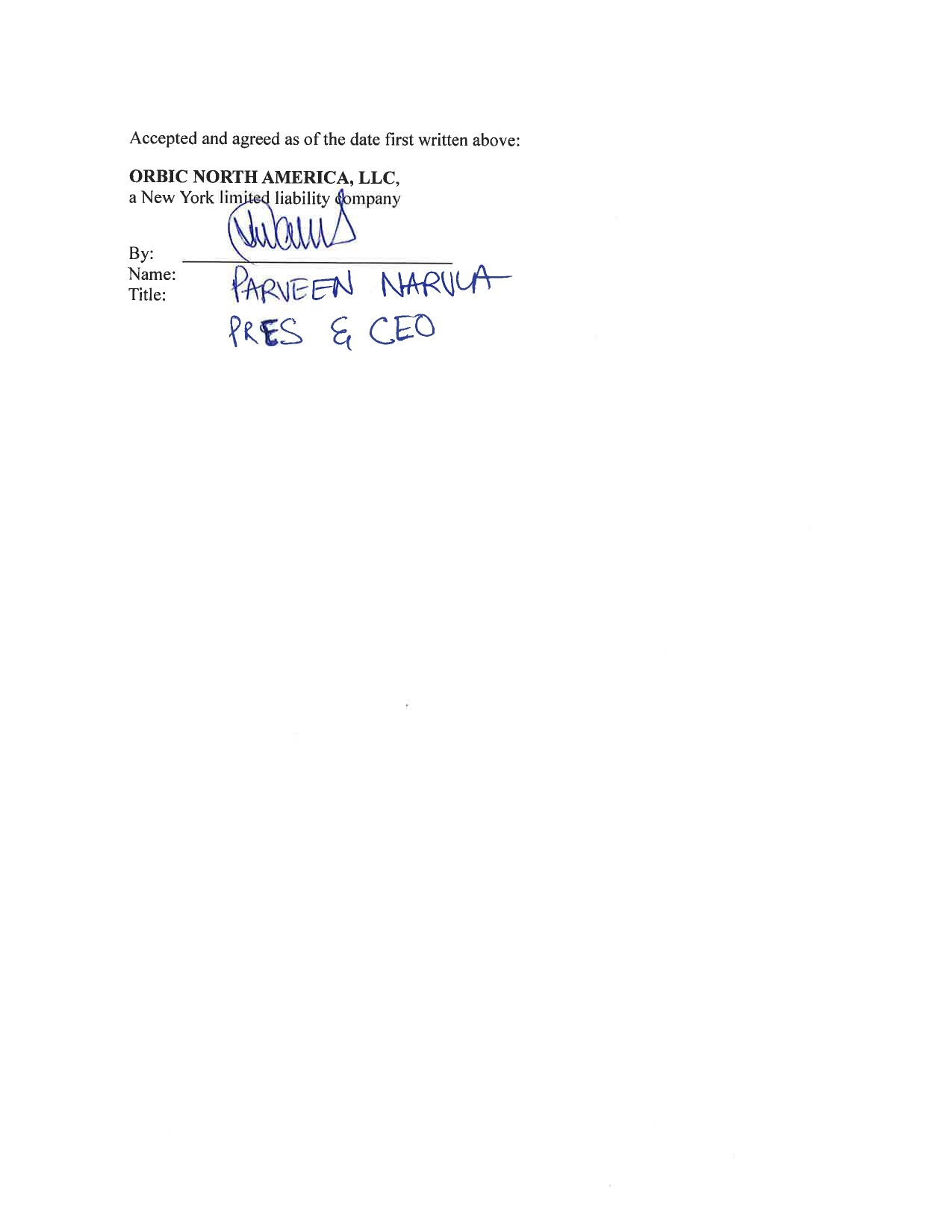 Accepted and agreed as of the date first written above: ORBIC NORTH AMERICA, LLC, a New York lim’ liability mpany By: Name: Title: