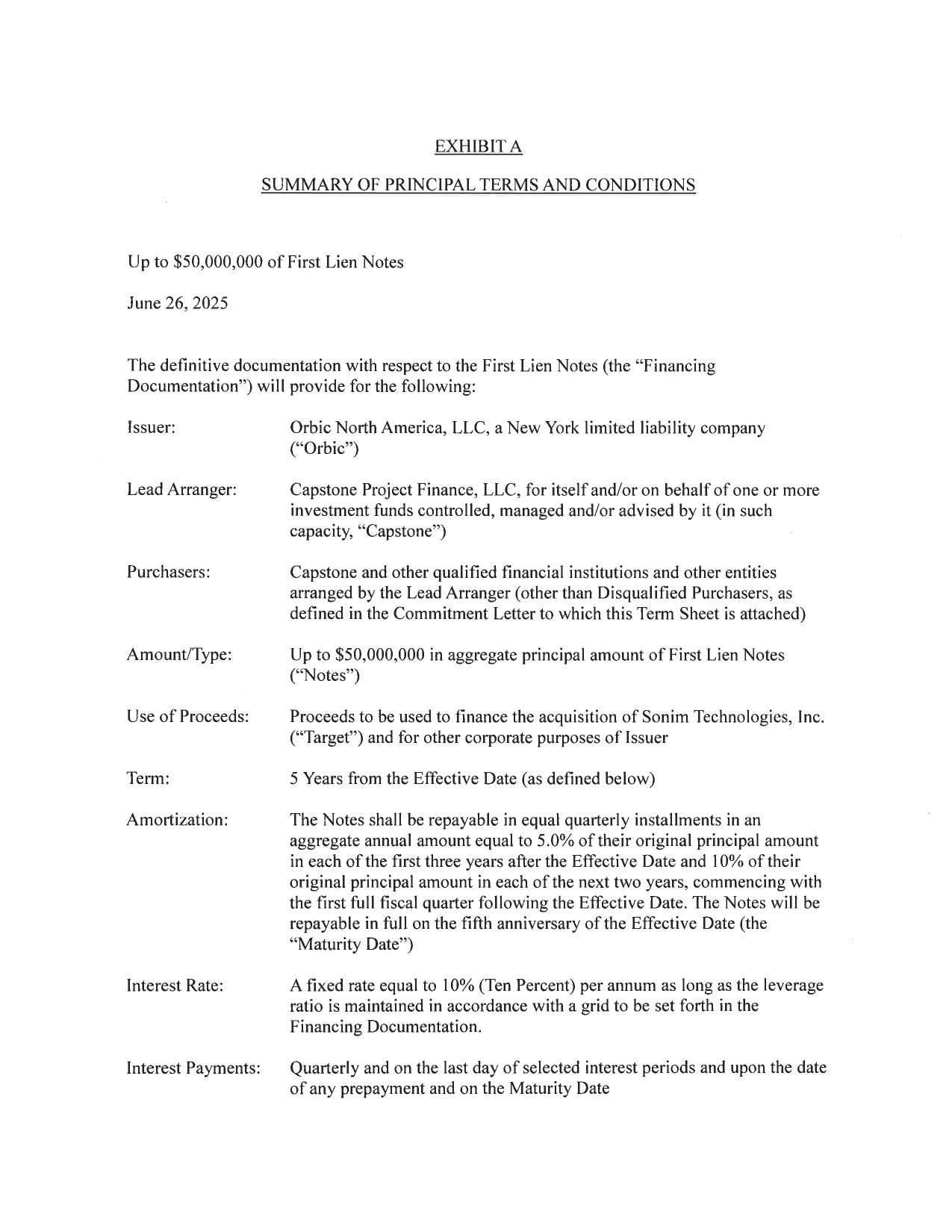 EXHIBIT A SUMMARY OF PRINCIPAL TERMS AND CONDITIONS Up to $50,000,000 of First Lien Notes June 26, 2025 The definitive documentation with respect to the First Lien Notes (the “Financing Documentation”) will provide for the following: Issuer: Lead Arranger: Purchasers: Amount/Type: Use of Proceeds: Term: Amortization: Interest Rate: Interest Payments: Orbic North America, LLC, a New York limited liability company (“Orbic”) Capstone Project Finance, LLC, for itself and/or on behalf of one or more investment funds controlled, managed and/or advised by it (in such capacity, “Capstone”) Capstone and other qualified financial institutions and other entities arranged by the Lead Arranger (other than Disqualified Purchasers, as defined in the Commitment Letter to which this Term Sheet is attached) Up to $50,000,000 in aggregate principal amount of First Lien Notes (“Notes”) Proceeds to be used to finance the acquisition of Sonim Technologies, Inc. (“Target”) and for other corporate purposes of Issuer 5 Years from the Effective Date (as defined below) The Notes shall be repayable in equal quarterly installments in an aggregate annual amount equal to 5.0% of their original principal amount in each of the first three years after the Effective Date and 10% of their original principal amount in each of the next two years, commencing with the first full fiscal quarter following the Effective Date. The Notes will be repayable in full on the fifth anniversary of the Effective Date (the “Maturity Date”) A fixed rate equal to 10% (Ten Percent) per annum as long as the leverage ratio is maintained in accordance with a grid to be set forth in the Financing Documentation. Quarterly and on the last day of selected interest periods and upon the date of any prepayment and on the Maturity Date