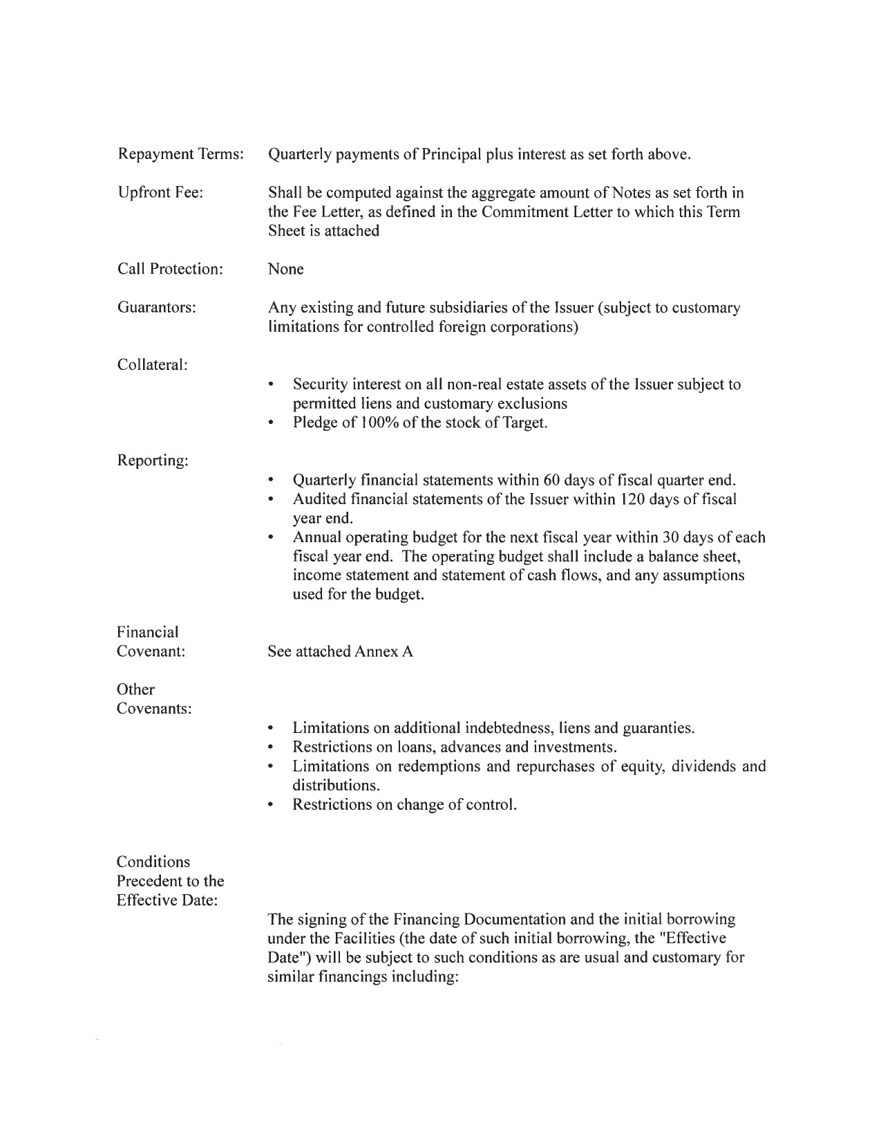 Repayment Terms: Upfront Fee: Call Protection: Guarantors: Collateral: • Security interest on all non - real estate assets of the Issuer subject to permitted liens and customary exclusions • Pledge of 100% of the stock of Target. Reporting: • Quarterly financial statements within 60 days of fiscal quarter end. • Audited financial statements of the Issuer within 120 days of fiscal year end. • Annual operating budget for the next fiscal year within 30 days of each fiscal year end. The operating budget shall include a balance sheet, income statement and statement of cash flows, and any assumptions used for the budget. Financial Covenant: Other Covenants: • Limitations on additional indebtedness, liens and guaranties. • Restrictions on loans, advances and investments. • Limitations on redemptions and repurchases of equity, dividends and distributions. • Restrictions on change of control. Conditions Precedent to the Effective Date: The signing of the Financing Documentation and the initial borrowing under the Facilities (the date of such initial borrowing, the "Effective Date") will be subject to such conditions as are usual and customary for similar financings including: Quarterly payments of Principal plus interest as set forth above. Shall be computed against the aggregate amount of Notes as set forth in the Fee Letter, as defined in the Commitment Letter to which this Term Sheet is attached None Any existing and future subsidiaries of the Issuer (subject to customary limitations for controlled foreign corporations) See attached Annex A