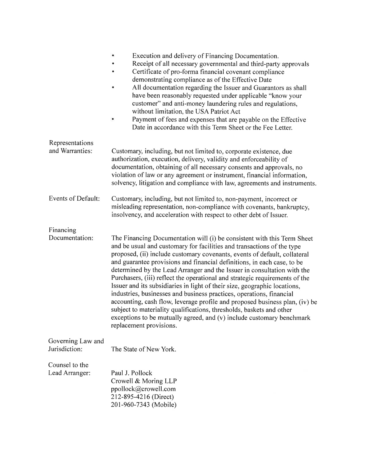 Representations and Warranties: Events of Default: Financing Documentation: Governing Law and Jurisdiction: Counsel to the Lead Arranger: • • Execution and delivery of Financing Documentation. • Receipt of all necessary governmental and third - party approvals • Certificate of pro - forma financial covenant compliance demonstrating compliance as of the Effective Date • All documentation regarding the Issuer and Guarantors as shall have been reasonably requested under applicable “know your customer” and anti - money laundering rules and regulations, without limitation, the USA Patriot Act Payment of fees and expenses that are payable on the Effective Date in accordance with this Term Sheet or the Fee Letter. Customary, including, but not limited to, corporate existence, due authorization, execution, delivery, validity and enforceability of documentation, obtaining of all necessary consents and approvals, no violation of law or any agreement or instrument, financial information, solvency, litigation and compliance with law, agreements and instruments. Customary, including, but not limited to, non - payment, incorrect or misleading representation, non - compliance with covenants, bankruptcy, insolvency, and acceleration with respect to other debt of Issuer. The Financing Documentation will (i) be consistent with this Term Sheet and be usual and customary for facilities and transactions of the type proposed, (ii) include customary covenants, events of default, collateral and guarantee provisions and financial definitions, in each case, to be determined by the Lead Arranger and the Issuer in consultation with the Purchasers, (iii) reflect the operational and strategic requirements of the Issuer and its subsidiaries in light of their size, geographic locations, industries, businesses and business practices, operations, financial accounting, cash flow, leverage profile and proposed business plan, (iv) be subject to materiality qualifications, thresholds, baskets and other exceptions to be mutually agreed, and (v) include customary benchmark replacement provisions. The State of New York. Paul J . Pollock Crowell & Moring LLP ppollock@crowell . com 212 - 895 - 4216 (Direct) 201 - 960 - 7343 (Mobile)