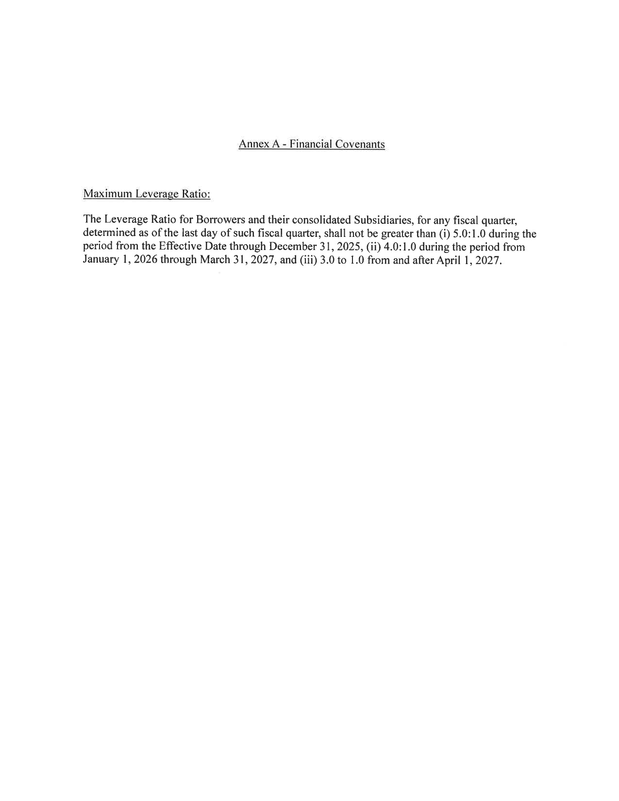 Maximum Leverage Ratio: The Leverage Ratio for Borrowers and their consolidated Subsidiaries, for any fiscal quarter, determined as of the last day of such fiscal quarter, shall not be greater than (i) 5.0:1.0 during the period from the Effective Date through December 31, 2025, (ii) 4.0:1.0 during the period from January 1, 2026 through March 31, 2027, and (iii) 3.0 to 1.0 from and after April 1, 2027. Annex A - Financial Covenants