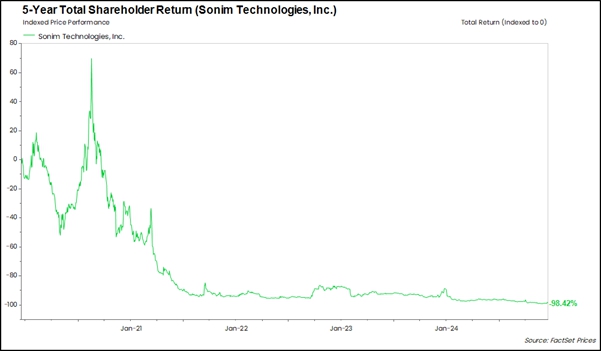 | Ø | Plummeting Stock Price: Sonim’s stock price declined 87% in 2024, capping of a decline of 98% over the five years ending June 18, 2025, sadly as shown in the chart below: |